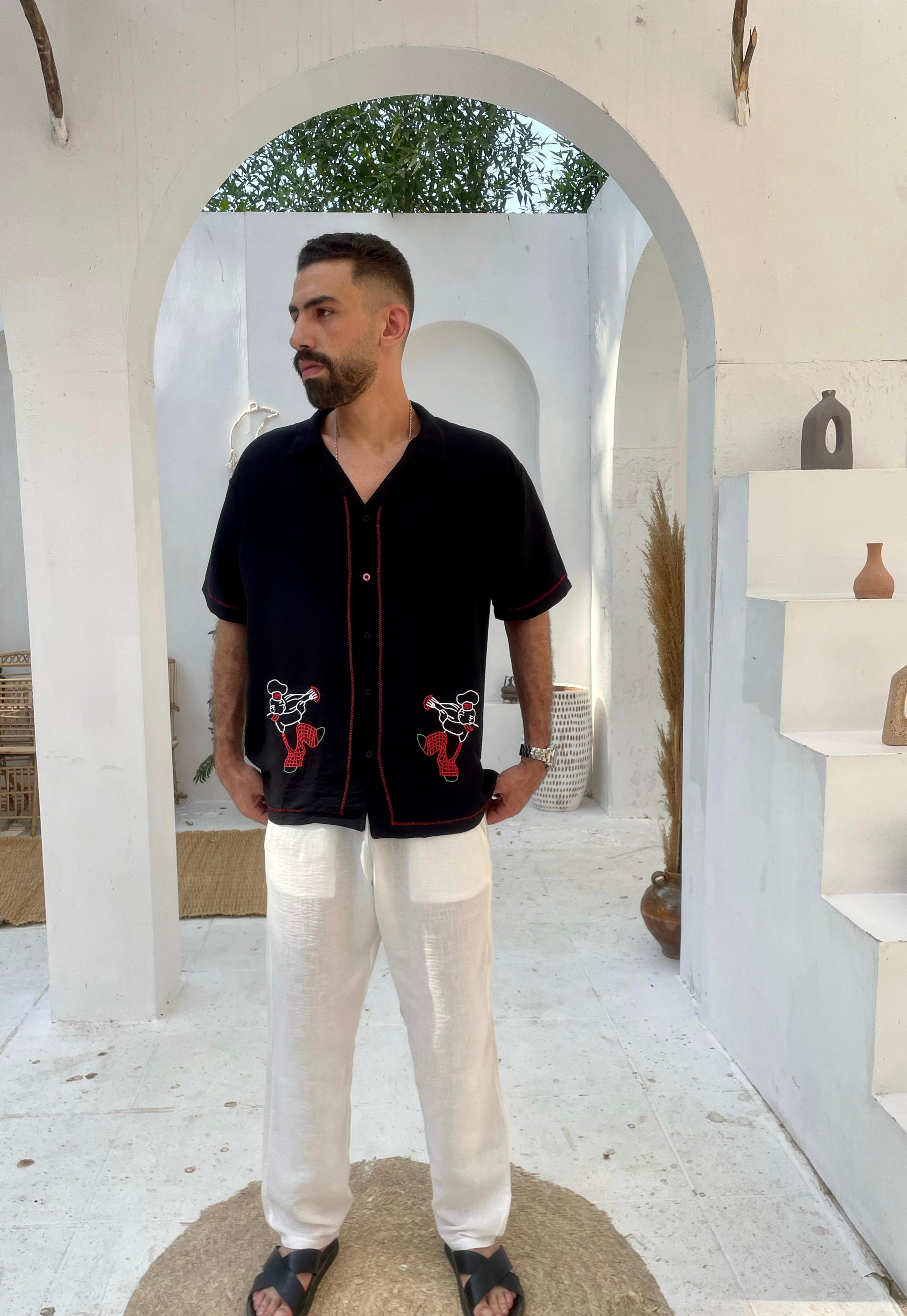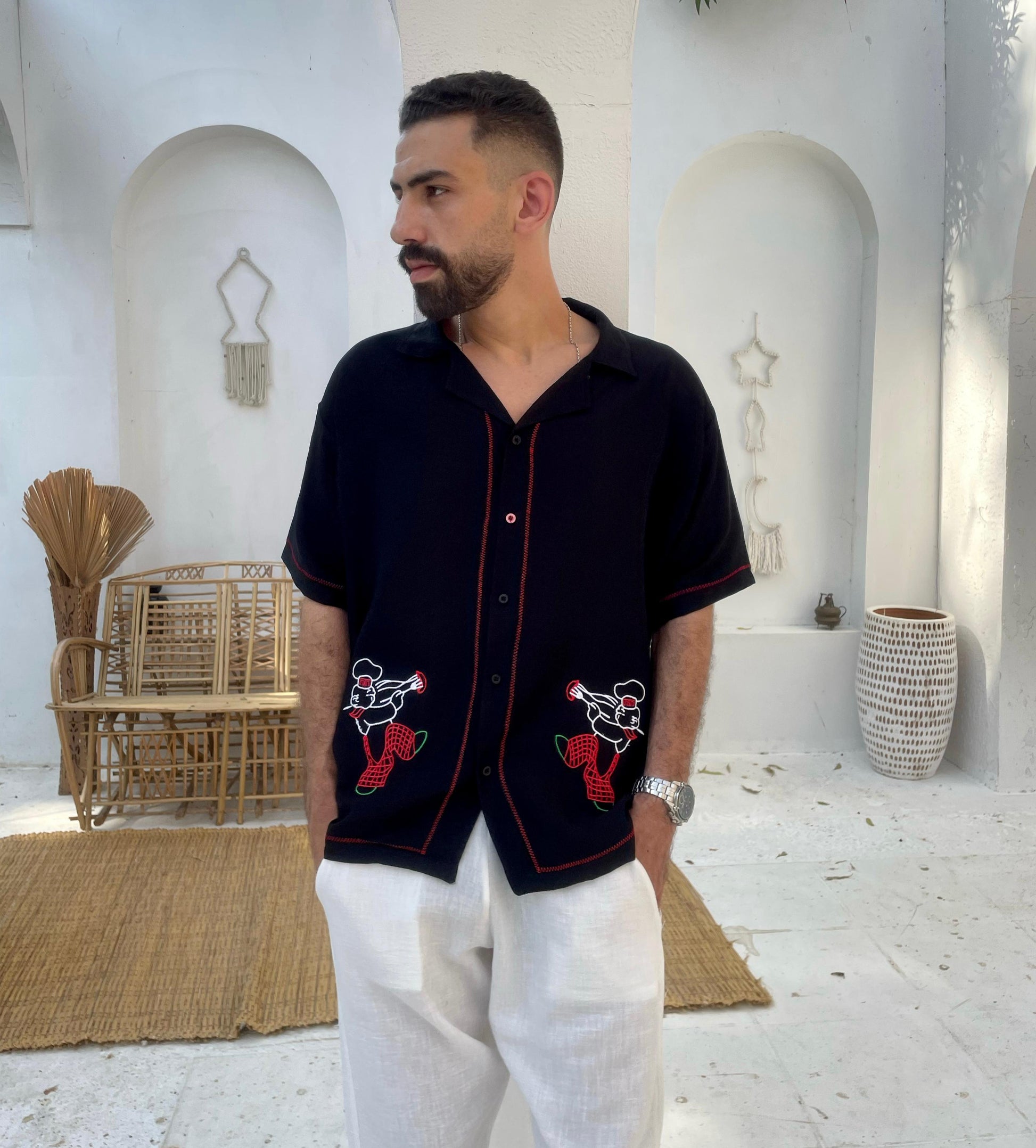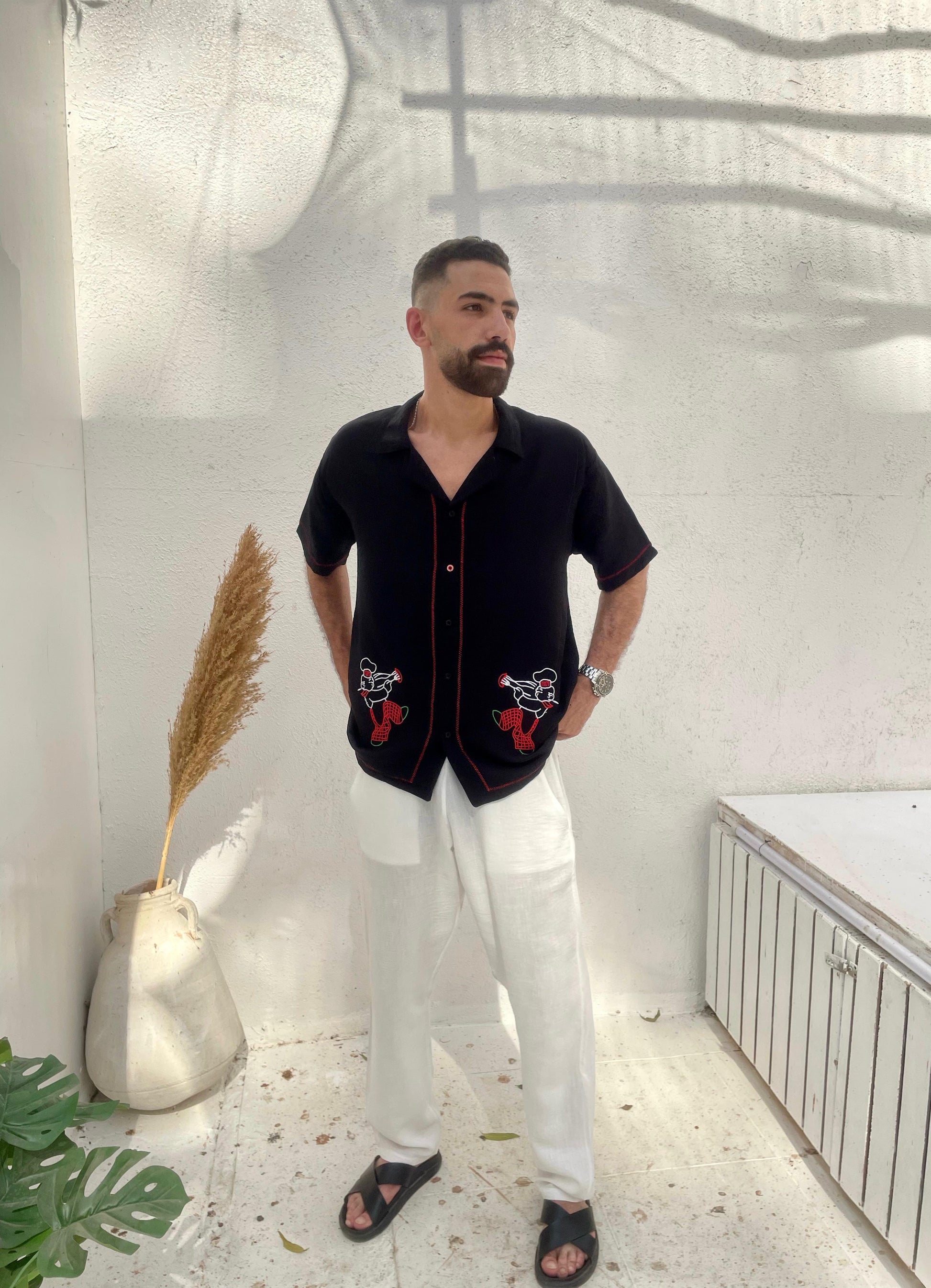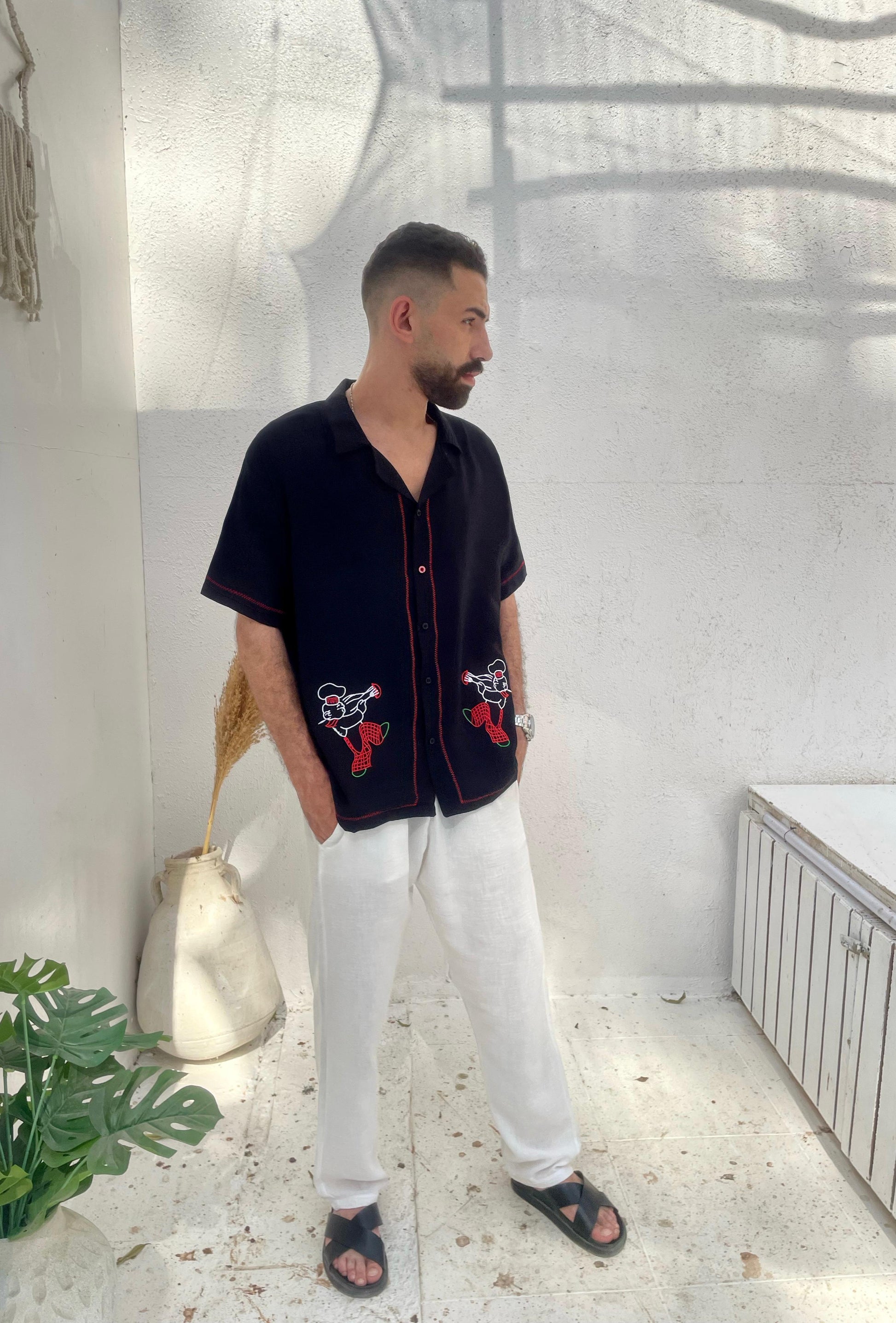 A black linen shirt with vibrant red accents and whimsical trumpet-playing chef embroidery. The deep base color contrasts playfully with the animated stitching, giving off an edgy yet artistic summer vibe. A bold choice for nights out and music-filled evenings.