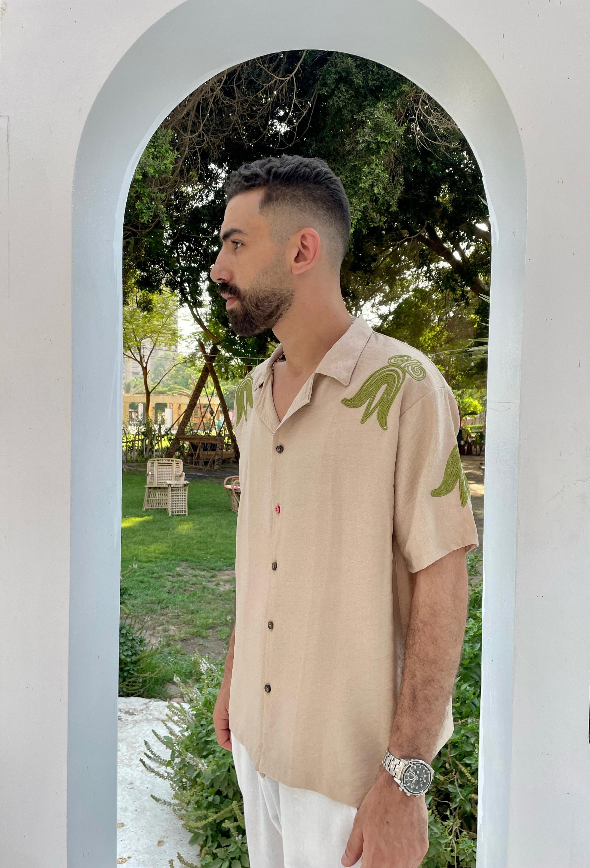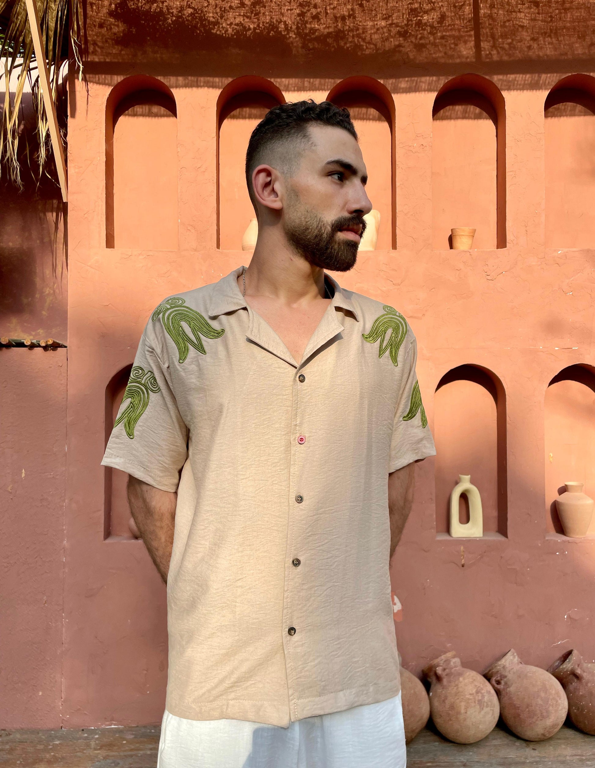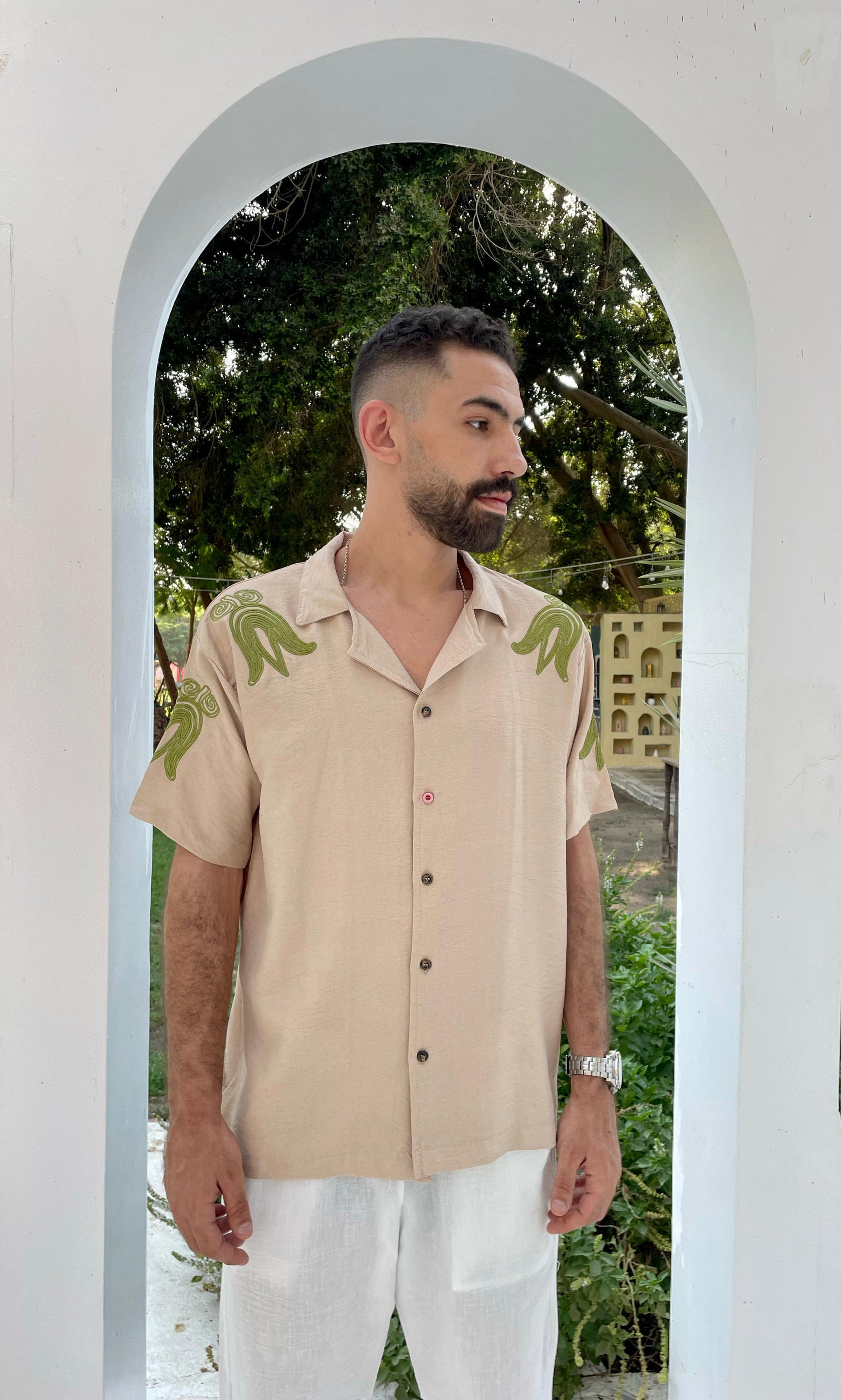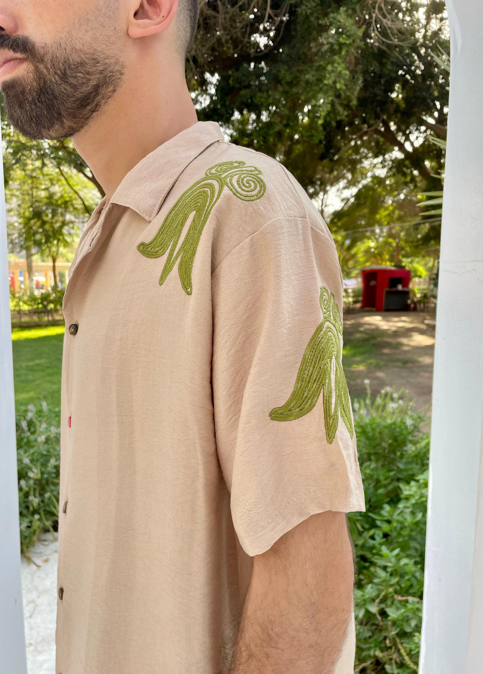This beige linen shirt features striking green flame embroidery on the shoulders — crafted to turn heads while keeping you cool all day.