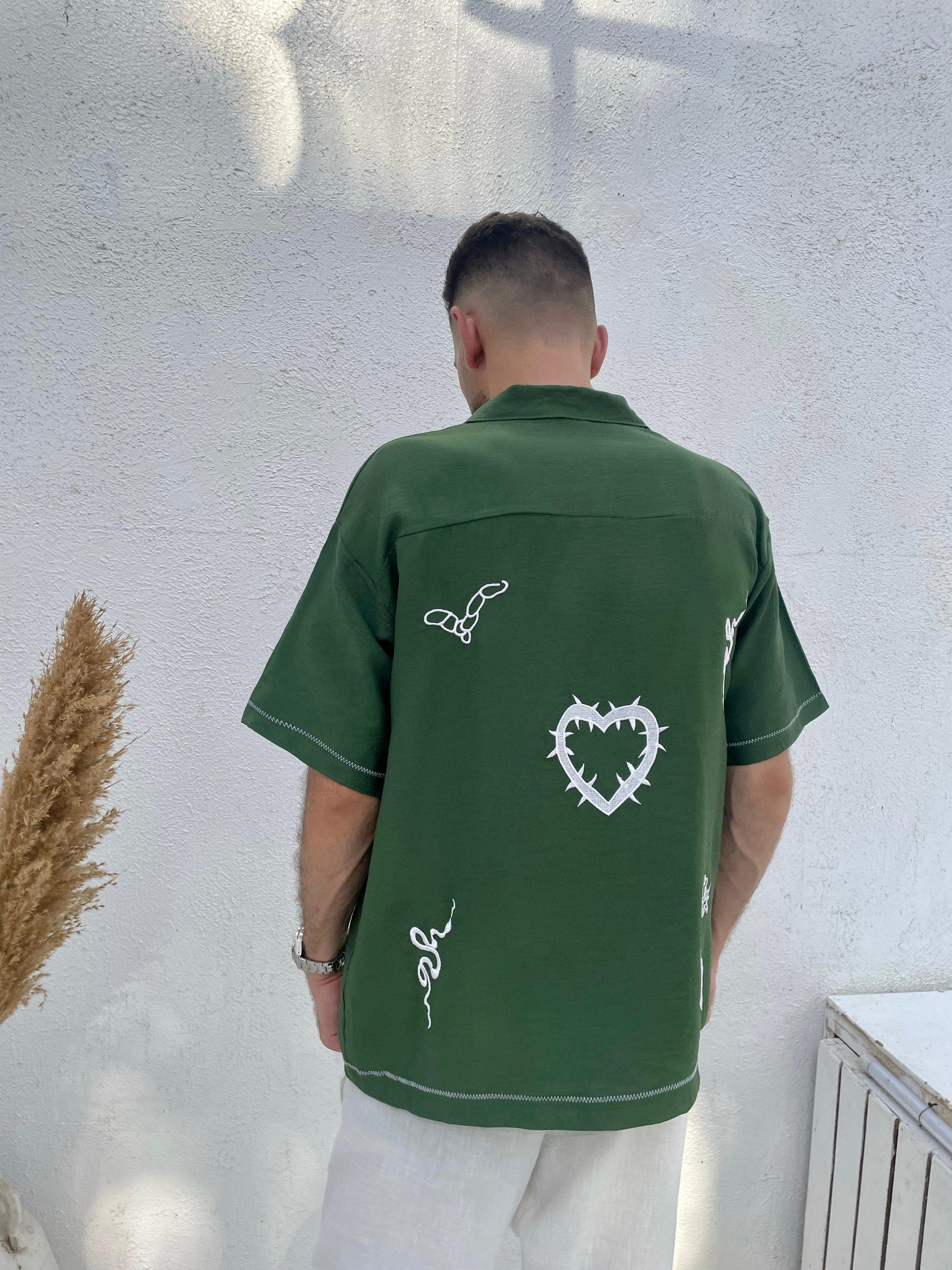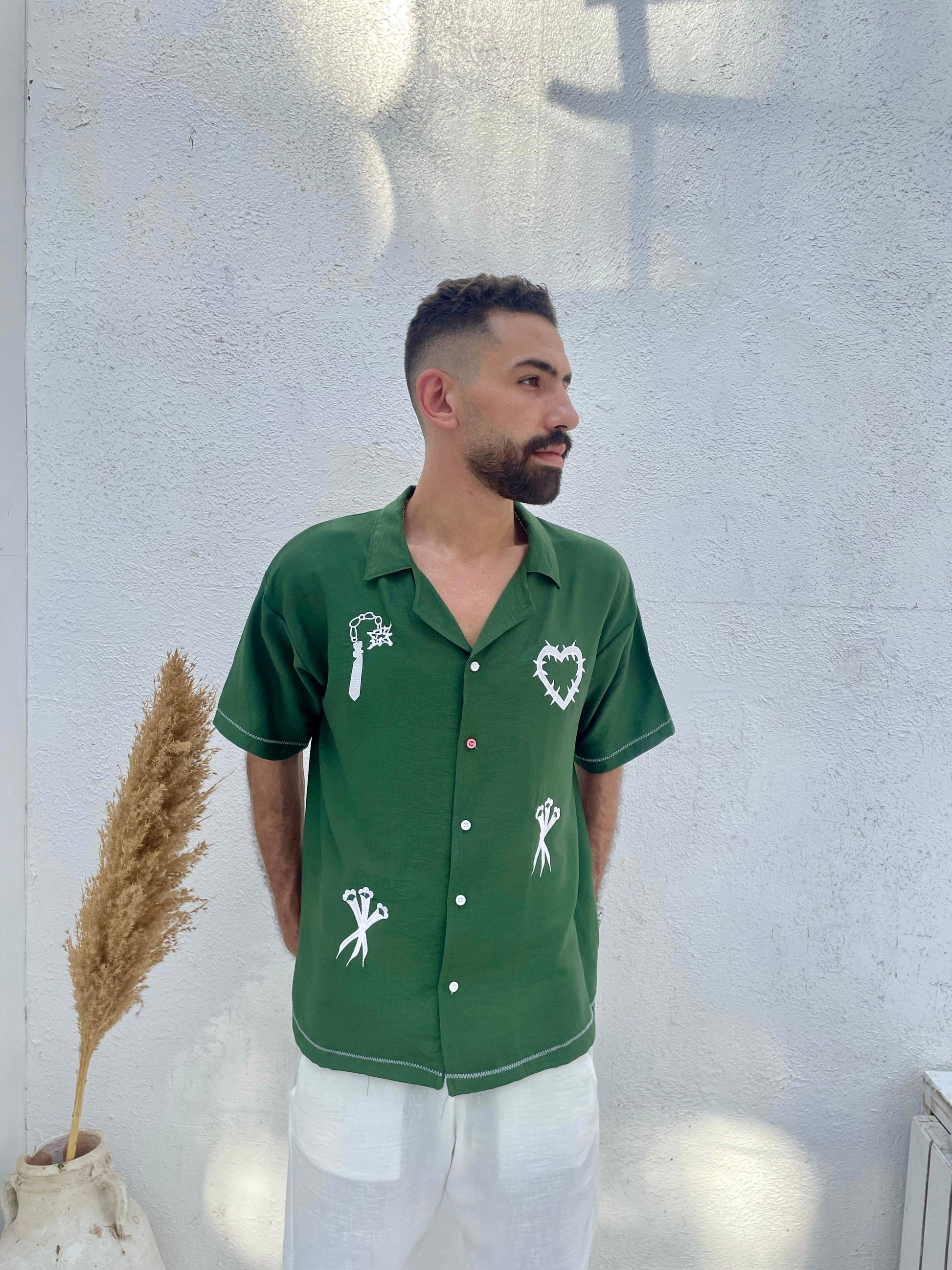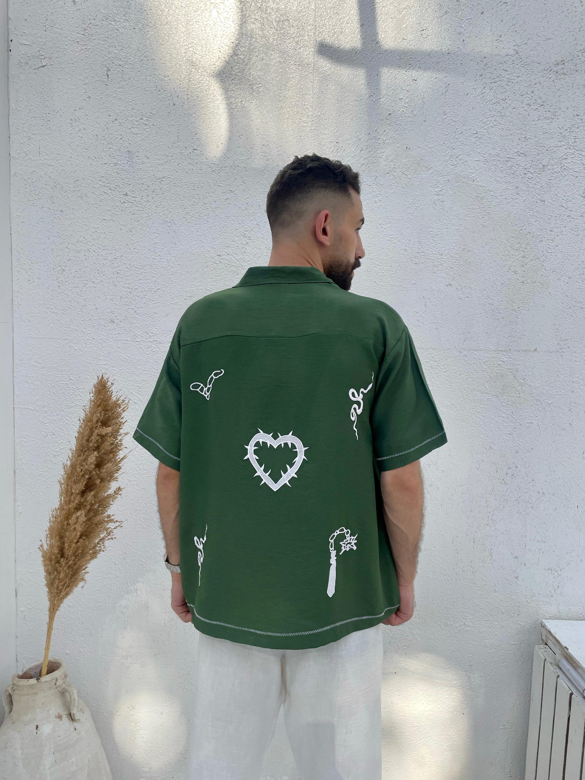"Sacred Bloom" evokes mysticism and nature through symbolic white embroidery over deep forest green linen. With motifs including a blooming dagger, a thorned heart, and tied flower bundles, this shirt blends botanical beauty with emotional depth. White stitching along the hem and sleeves adds subtle structure, while the soft, open-collar silhouette maintains effortless summer elegance.