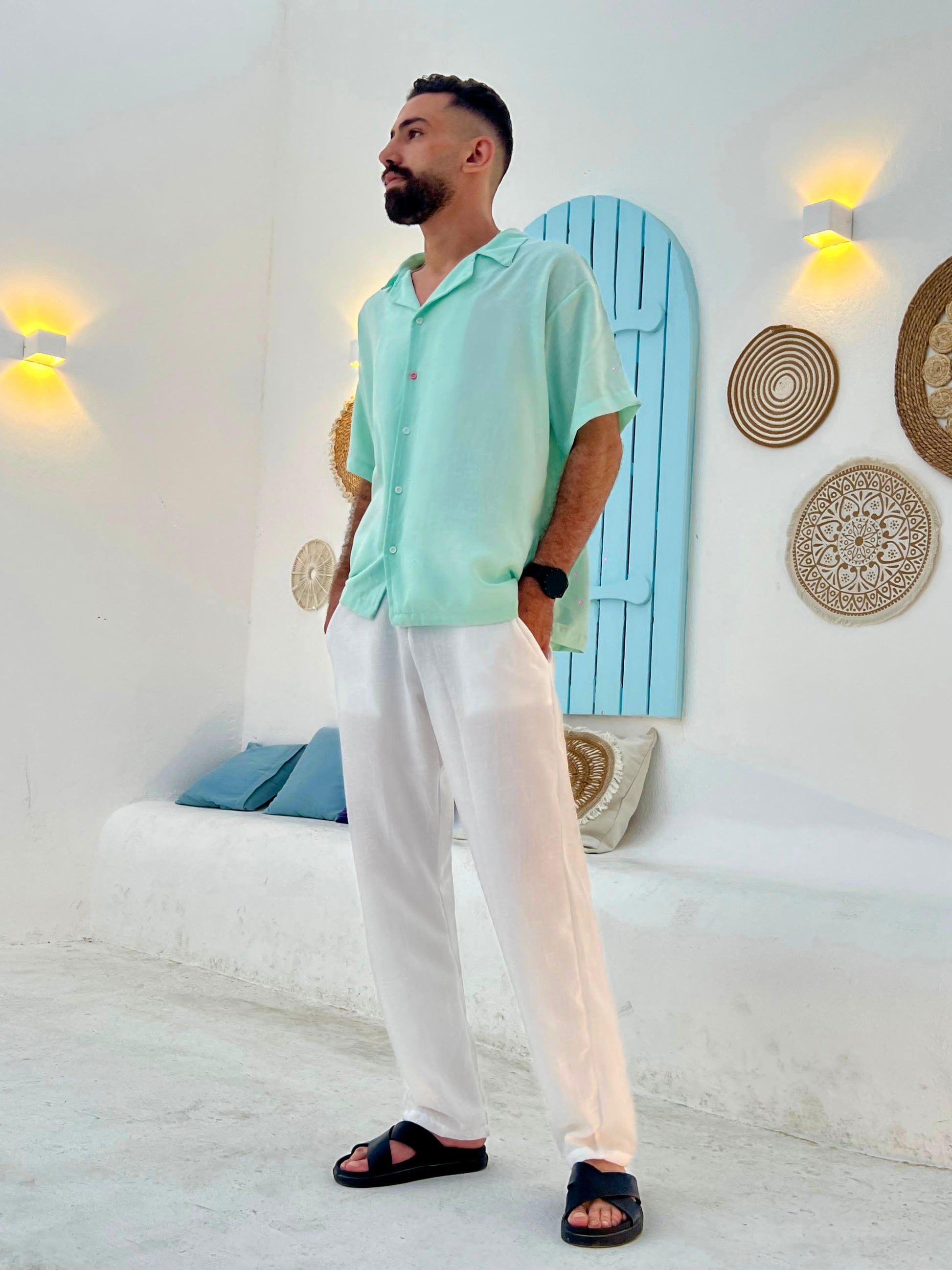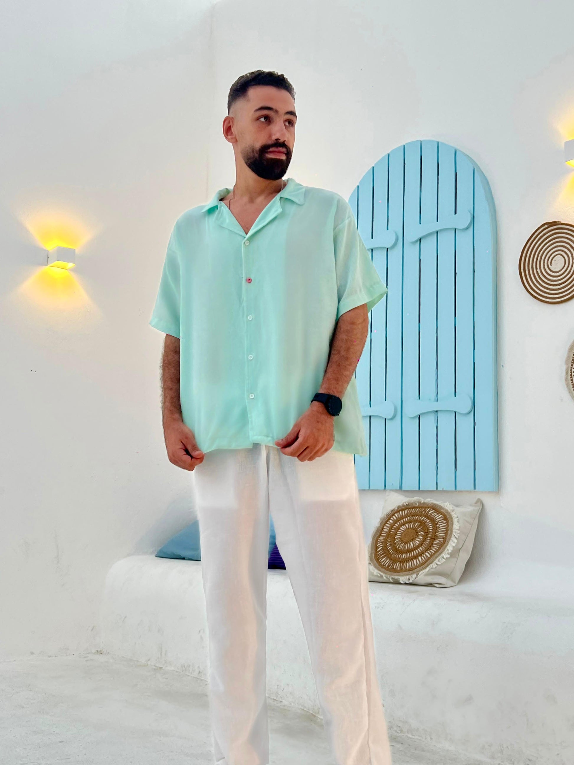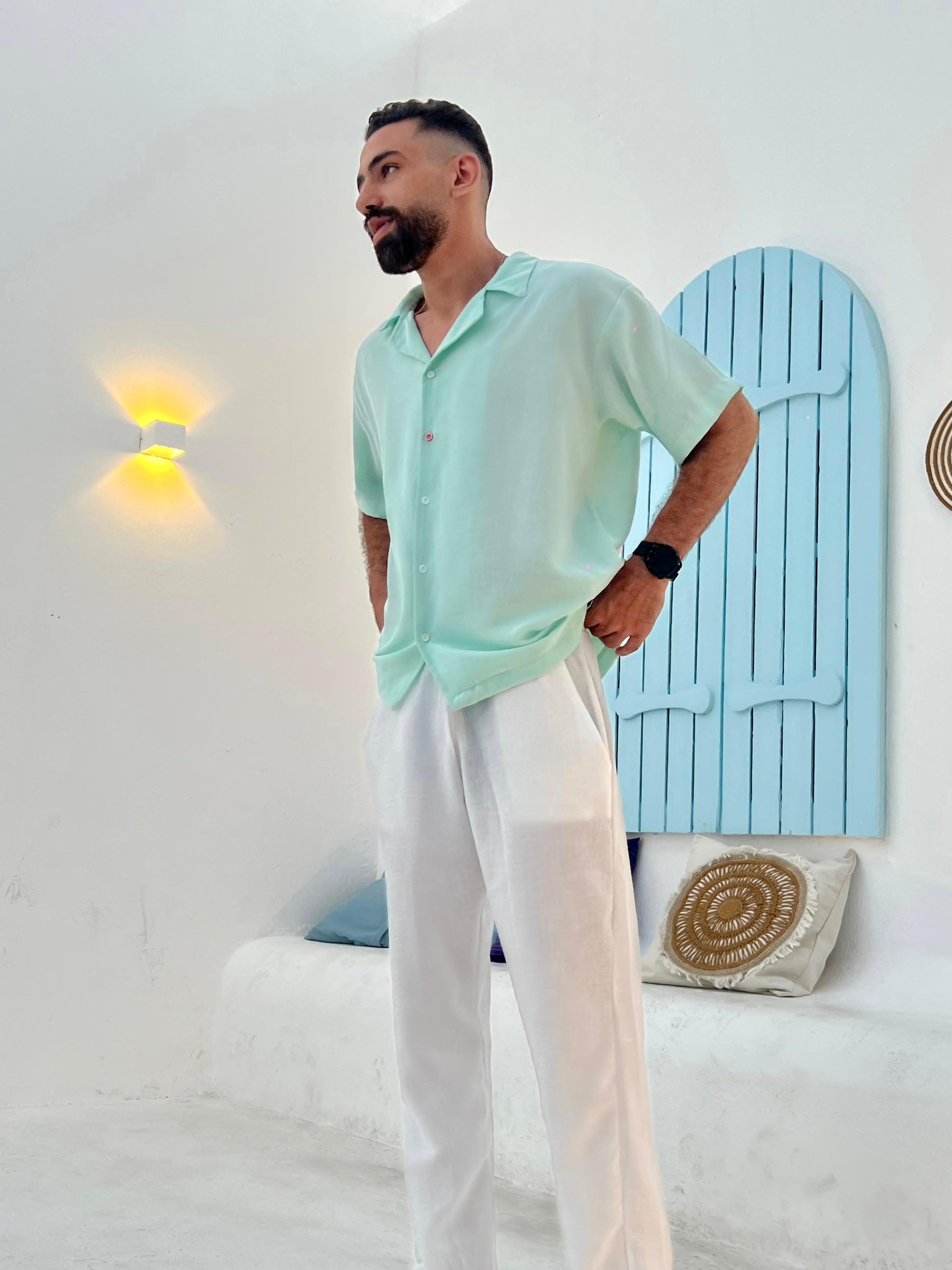 A lightweight linen-blend tee in a clean mint tone — tailored for comfort, built to breathe, and designed to stand out subtly.